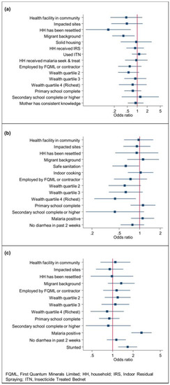 Determinants of health outcomes during the 2015 follow-up health survey, with adjusted odds ratios and 95% confidence intervals, Trident project, Zambia: (a) determinants of P. falciparum in children aged 6–59 months; (b) determinants of stunting in children aged 0–59 months; and (c) determinants of anaemia in children aged 6–59 months.