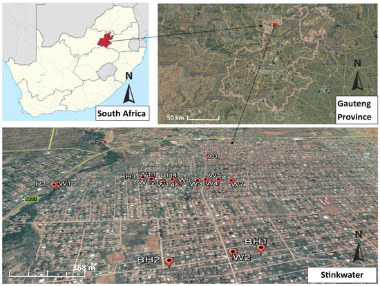 The Stinkwater community lies in the northern part of the Gauteng Province of South Africa, close to the border with the Northwest Province. Presently, the Stinkwater community consist of eight extensions comprising a total of 8250 households spread over an estimated surface area of 27.92 km2 [22]. Although the main portions of the Stinkwater community consist of subsidised housing, there also exist informal settlements in the area, especially in the outer boundaries of the community [23]. A remarkable characteristic of the Stinkwater community is the lack of access to piped water [24]. As such, the inhabitants are dependent on water delivery from roaming municipal water tankers. As municipal water deliveries are often sporadic, many residents habitually rely on water obtained from hand-dug wells or boreholes in their yards or other communal areas.