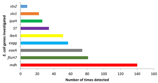 The overall prevalence of each virulence gene investigated in the current study is shown in Figure 2. Almost all samples (139/140; 99.3%) were positive for at least one of the pathogenic E. coli virulence genes investigated in the current study.
