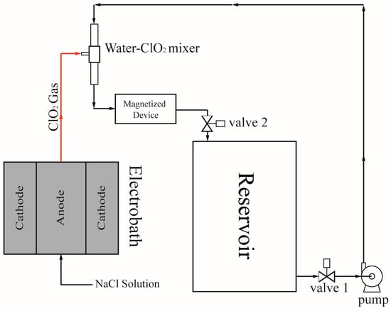Chlorine dioxide, a strong oxidant, can inhibit or destroy microbes [1,2,3,4,5]. Studies have investigated the application of chlorine dioxide in numerous fields such as water or wastewater treatment, environment and food disinfection, and medicine [6,7,8,9,10,11,12,13]. Typically, chlorine dioxide is produced using either an acid-based or an electrolytic method [7,8,10,12]. In the acid-based method, chlorine dioxide is produced by mixing starting materials, such as sodium chlorite and hydrochloric acid, sodium chlorite and ferric trichloride, or sodium chlorite and chlorine gas. In the electrolytic method, the reactants are aqueous sodium chloride or saturated saline and sodium hypochlorite.