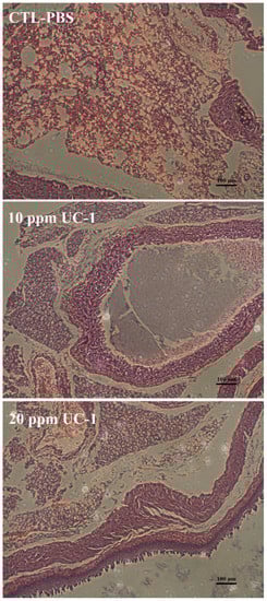 In an inhalation toxicity test, we used 0, 10, and 20 ppm UC-1, which was administered as mist by using a humidifier in an airtight box containing five mice. The test showed no abnormality and no mortality for the control and test components within 24 h (Table 3). The weights of the heart, liver, spleen, and kidney of the test group did not differ significantly from those in the control group (Table 4). Hematoxylin and eosin staining of the mice lung sections (Figure 4) showed that 10 and 20 ppm UC-1 did not induce significant clinical signs of changes in the mouse lung cells at 24 h. Therefore, inhalation of 10 and 20 ppm UC-1 did not cause irritation in the mice.