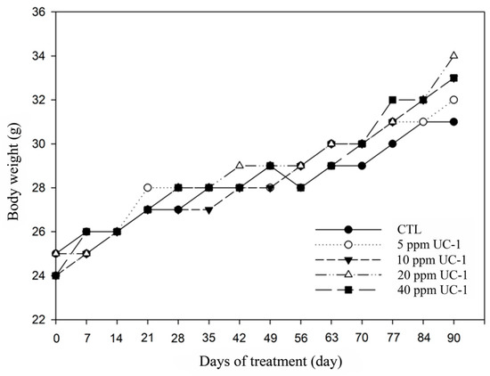 Twenty-five 4-week-old BALB/c male mice were purchased from the National Laboratory Animal Center; they were quarantined and acclimatized before treatment in an animal room at China Medical University. The animals were fed ad libitum and maintained at 20–25 °C under 65%–80% humidity. Five mice were housed in one cage and fed 0 (PBS; control), 5, 10, 20, and 40 ppm UC-1 (test solutions) continuously for 90 days. PBS or test solutions fed as drinking water were freshly prepared daily before treatments.