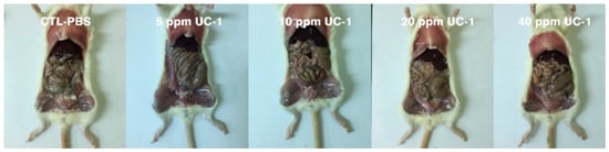 In the subchronic oral toxicity test, 0, 5, 10, 20, and 40 ppm UC-1 was prepared to feed the mice. Clinical observations of the mice showed no abnormality and no mortality after 90 days for the control and test groups (Table 5). The mouse weight was not influenced (Figure 5). Moreover, necropsy and gross examination did not show any pathological symptoms (Figure 6). The weights of the heart, liver, spleen, and kidney of the test groups did not differ significantly compared with those in the control group (Table 6). Therefore, administration of up to 40 ppm UC-1 to mice for 90 days is nontoxic.