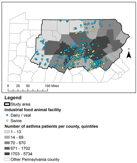 Rasmussen, S.G.; Casey, J.A.; Bandeen-Roche, K.; Schwartz, B.S. Proximity to Industrial Food Animal Production and Asthma Exacerbations in Pennsylvania, 2005–2012. Int. J. Environ. Res. Public Health 2017, 14, 362. https://doi.org/10.3390/ijerph14040362