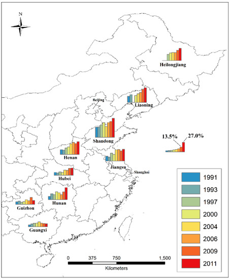 The CHNS is an ongoing open cohort study initiated in 1989, and was designed to examine the population’s health and nutritional status in eight provinces across China (Figure 1), which varied substantially in such factors as geography and economic development, including Liaoning (not surveyed in 1997), Shandong, Henan, Jiangsu, Hubei, Hunan, Guangxi, and Guizhou [13]. Heilongjiang was enrolled as a ninth province in 1997 (Figure 1).