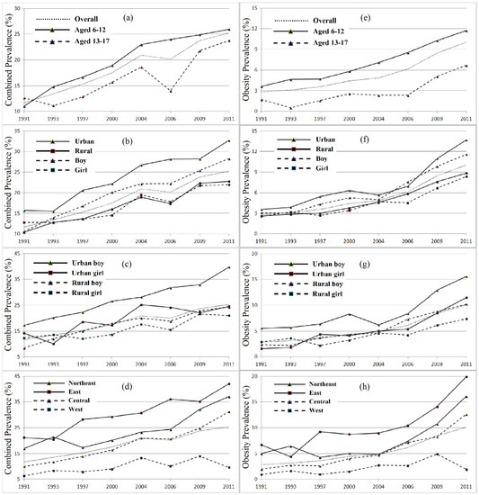 Overweight and obesity were defined based on the International Obesity Task Force (IOTF) recommended Asian age-sex-specific cut-offs corresponding to BMI ≥ 23 and 27 at age 18, respectively [14]. Overall children were stratified by age (≤12 and >12), gender (boy and girl), urbanicity (urban and rural), and region (northeast, east, central, and west [16]). Ow/ob and obesity prevalence were calculated for each category in each wave.