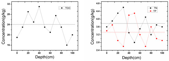 The total organic carbon (TOC), total nitrogen (TN), and total phosphorus (TP) distribution of the sediment at depths of 0–100 cm (the dotted line represents the average value).