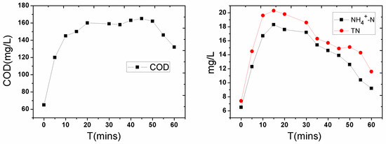 NH4+-N and TN showed similar trends compared to those of the COD, except that the maximum value was reached earlier (between 15–20 min), because NH4+-N had the characteristics of slow adsorption and quick release in the sediment. The NH4+-N increased from 6.3 mg/L to 18 mg/L, and TN increased from 7.2 mg/L to 20.3 mg/L, with a shorter platform in this time period (15–30 min), and then significantly reduced after 45 min, as shown in Figure 2. This is mainly because part of the ammonia nitrogen was directly blown off in the form of ammonia during the intense aeration process [26,27].