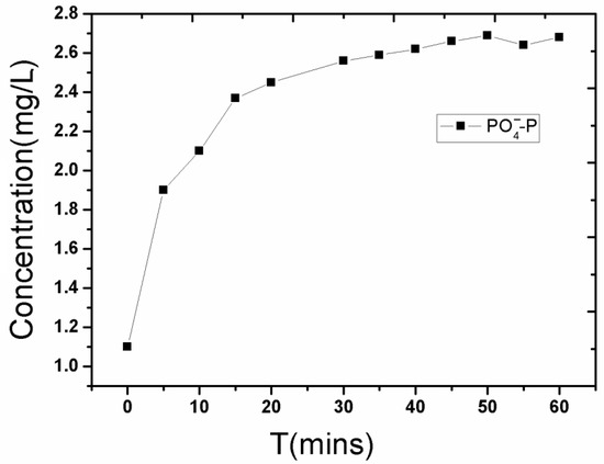 The content of soluble phosphate continuously rose, with the highest level occurring from 0–10 min. Then, the increasing trend slowed, as shown in Figure 3; the soluble phosphate increased from 1.1 mg/L to 2.1 mg/L during the first 10 min, and rose slowly to 2.6 mg/L in the following 50 min. This is because part of the soluble phosphate dissolved into overlying water during the disturbance process. On the other hand, the soluble phosphate was easily adsorbed on the suspended particles [15], with a strong adsorption force, which resulted in a slower release.