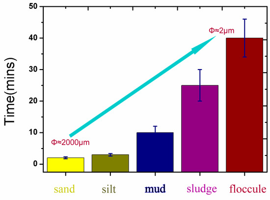 The sediment was completely suspended within 2 to 5 min after sufficient aeration, but the settlement order of the particles showed significant differences because of their density and hydrophobicity. Figure 4 shows that sand and coarse silt subsided within 0–10 min, the mud and sludge layer slowly settled in 10–20 min, and the floccule settled in 30–50 min. The entire process lasted about 3 h, until the thickness of the sediment remained basically unchanged. Finally, the distribution of particles with different sizes in the sediment followed a regular pattern, where large particles, such as grit and sand, settled on the bottom, and the floccule or floated sludge contained many pollutants in the upper layers, as shown in the schematic diagram in Figure 5.