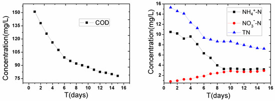 Figure 8 shows the changes of COD, NH4+-N, NO3−-N, and TN in the overlying water. Compared with the initial state, the COD rapidly decreased from 151 mg/L to 95 mg/L during the first 5 days, and slowly decreased during the next 10 days, because the organic matter, which could be degraded by aerobic microorganisms, degraded during the first stage, and a small proportion of the remaining macro-molecular organics, such as protein, cellulose, and parts of the hydrophobic organic contaminants, degraded during the next stage [13]. Here, the COD was still slightly higher than it was during the initial state because the release speed of the organic matter from the sediment to the water was faster than the degradation speed in the water, and the COD continuously decreased with aeration or sediment adsorption. On the other hand, NH4+-N showed the largest decrease under the sediment aeration condition (10.5 mg/L to 3.1 mg/L), whereas NO3−-N increased from 0.3 mg/L to 2.9 mg/L. This indicated that the aeration could effectively prompt the ammonia nitrogen conversion to nitrate nitrogen. The TN also reduced almost 50% compared with its levels at the initial state (15.2 mg/L to 7.6 mg/L).