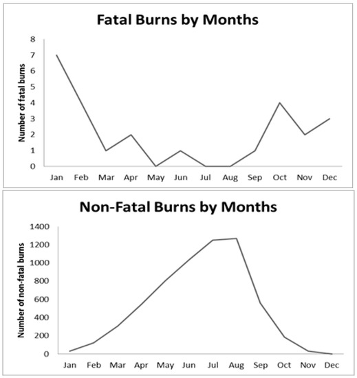 Fatal and non-fatal burn injuries across the months.