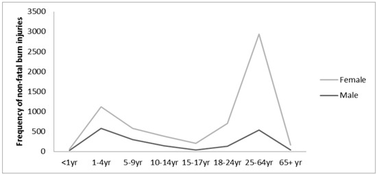 Distribution of Non-fatal burn injuries across age and gender.