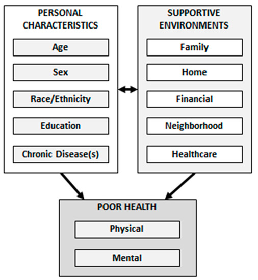 The purposes of this study were to investigate associations of personal characteristics and supportive environments on poor health among older adults aged 65 and over. More specifically, this study examines factors associated with poor physical health, poor mental health, and poor combined physical/mental health. Personal characteristics examined were age, sex, race/ethnicity, education, and number of chronic diseases. Supportive environments included were: family, home, financial, neighborhood, and healthcare. An aging population appropriate conceptual framework of personal characteristics and environments associated with poor health status was used in this study (see Figure 1). The framework postulates that personal characteristics and supportive environments have direct influences on health status. However, the model also reflects how individuals with different personal characteristics may influence, or be influenced by, their various environment types. The constructs and pathways of this framework are supported by considerable research examining social determinants of health [33,34,35,36,37,38,39,40,41,42,43,44].