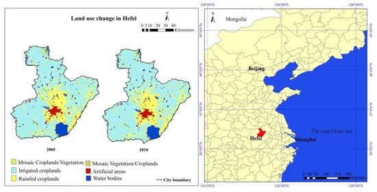 The study area is in Hefei city, which is located in the middle of Anhui Province in China. The city comprises a total area of around 7029 km2 and had a population of about five million prior to 2010. The land use in Hefei in 2005 and 2010 is shown in Figure 1. The data set with a spatial resolution of 300 m is provided by the Database of Global Change Parameters, Chinese Academy of Sciences [].
