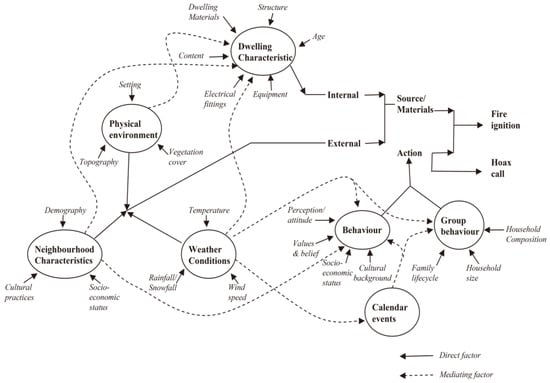 Although the study area is small relative to previous studies, there still exists considerable diversity in its socioeconomic, climate, topographic, and other attributes. In previous studies, researchers mainly adopted complex socioeconomic factors for fire occurrence and fire risk, which include population density, population structure, road density, slope, and other factors. These factors play important roles in fire occurrence, as shown in Figure 2, which is a conceptual summary of various fire risk factors and was developed by Corcoran et al. [].