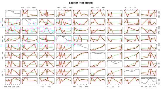 Moreover, we conducted a deeper analysis by using a scatter point matrix to study the internal relationships between the annual explanatory predictors and the per capita annual fire frequency. The results are shown in Figure 3, which indicates that almost all of the predictors have a certain degree of deviation. These predictors have a positive effect on fire frequency except sunshine duration. In addition, the correlations about the per capita annual fire frequency and the change in population are shown in Figure 4. It shows that the plot of per capita annual fire frequency has a very similar trend to the plot of annual fire frequency, which could be explained by the population growth and the fire risk caused by human activities.