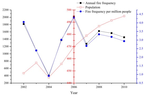 Annual summaries for fire records (2002–2010) and the relationship with population growth.
