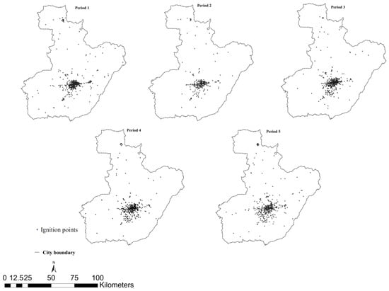 In order to make comparisons between GTWR and other models, we divided the entire time period of nine years into five temporal periods of nearly 22 months each. Thus, we could obtain the spatial distribution of the fire ignition points for different time periods. The spatial distribution of fire ignition points is shown in Figure 5 The response variable, called average fire density, was derived using the kernel density method, which turns discrete points in a study area into a continuous density surface to minimize the uncertainty and mistakes in the ignition records []. Fire density is defined in this study as the ignition frequency in one grid cell (occurrence number per period per km2).
