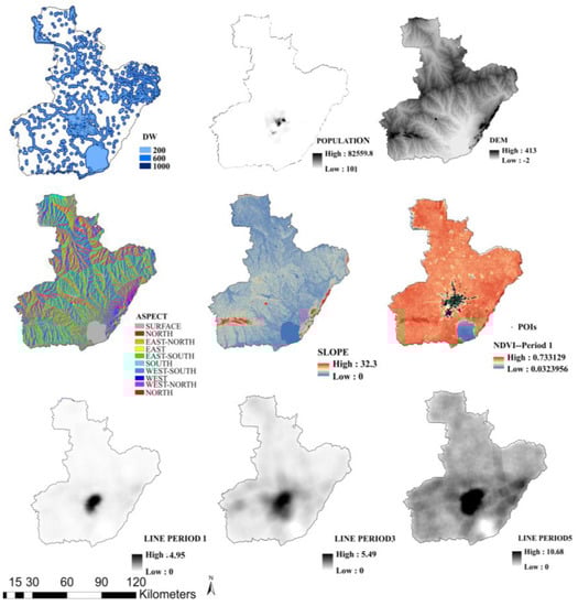 A total of 25 explanatory variables covering a variety of socioeconomic attributes were extracted from the databases [,,,,,]. These variables consider the influence of socioeconomic conditions on fire occurrence, as well as the influence of climate and topographic conditions. These explanatory variables were derived from the previous literature and several new variables consisting of the spatial distribution of buildings were selected for the modeling process of infrastructure fire occurrence. These explanatory variables are shown in Table 2. Some variables, including static and dynamic variables, are illustrated in Figure 6. It should be noted that the uncertain geographic context problem (UGCoP) could affect the reallocation of fire risk spatiotemporally because of the dynamic change of socioeconomic attributes in urban areas []. This highlights the reason for the need of spatiotemporal models. All the explanatory variables were resampled to a resolution of 1 km × 1 km to achieve the same resolution as that of the fire density.