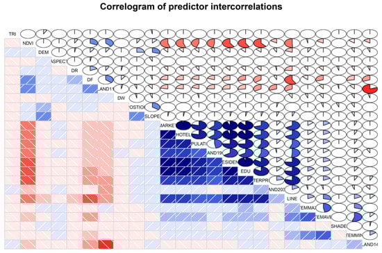All the variables were investigated and the fire density obtained by using the kernel density was converted by using a natural logarithm transformation. The variables ENTERPRISE, EDU, HOTEL, RESIDENT, and MARKET were converted by using a Box-Cox transformation when the value of λ was −0.5. All of the independent variables were then standardized. After the collinearity analysis that examined the correlations among the independent variables, LAND11, HOTEL, LANDOTHER and EDU were excluded from the modeling process. Further, we obtained the correlations among the predictor variables and visualized the results using the “corrgram” package in R studio (Figure 7). As shown in Figure 7, we reordered on the rows and columns of the matrix (made by principal component method) in order to have similar variables with related patterns together. We obtained the variance inflation factor (VIF) values of these variables except for the five dummy variables for the land use types. There was no VIF value greater than 5, indicating that there exists no multicollinearity among the variables. The remaining independent explanatory variables were included in the initial SCV and CV training processes.