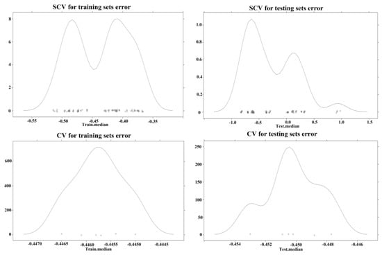 Kernel density plot for prediction error produced by SCV and CV. The small circles represent each data subset created from bootstrap.