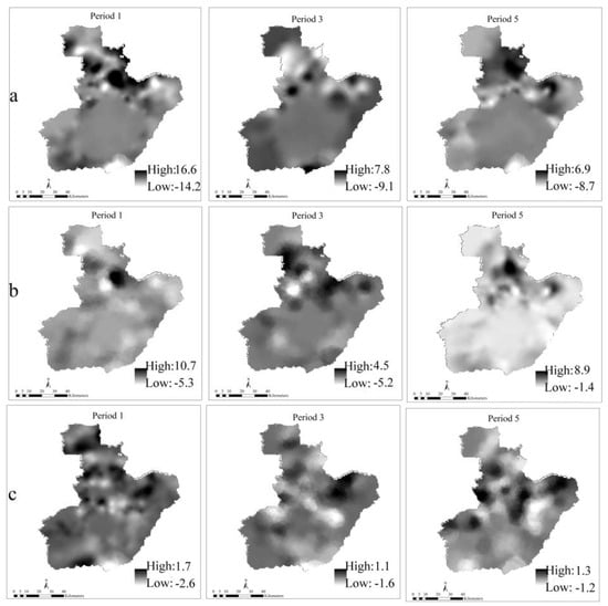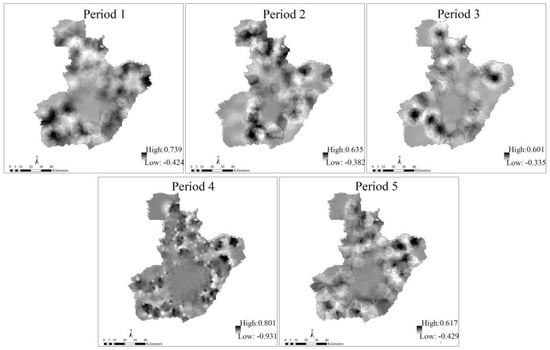 The spatial distribution of the residuals was tested by using semivariograms and taking period 1, 3 and 5 as an illustration (Figure 11). As for GWR and LM, the semivariograms indicate a spatial autocorrelation for the residuals of the dependent variable with a spatial lag of up to nearly 12 km; the semivariance remains rather steady up to 100 km, beyond which it increases again to some extent. This is good proof that the various spatial clustering patterns change at different spatial scales. The GTWR model showed lower values of semivariance than the other two models, and exhibited a flat semivariance line for the entire distance, as indicated by the fit curve in Figure 11. The results show a strong ability of the GTWR model for explaining the spatial structure. The distribution of the residuals for all time periods is shown in Figure 12, which indicates that the residuals in the GTWR model are mostly generated outside the center of the city. In addition, the spatial shape and scope of the distribution of the residuals are different for the five time periods.