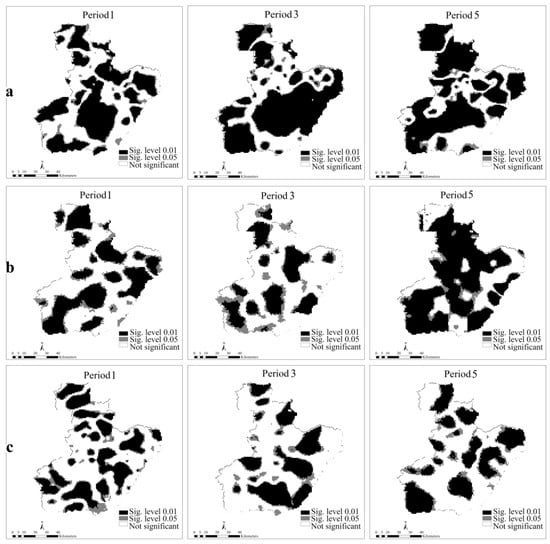 t-test values of the coefficients for GTWR in different periods at the resolution of 100 m. The letters (a–c) represent ENTERPRISE, LINE, and DEM respectively. The darker of the color, the more significant the coefficient is. White means the variable is not significant within that region, black indicates the variable is at the significance level of 0.01, and dark gray indicates a significance level of 0.05 (t-test value is 2.58 and 1.96 respectively).