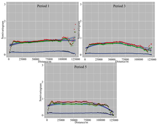 In view of residual spatial autocorrelation (RSA), if no autocorrelation remained in the residuals of the regression models, the spatial pattern observed in the dependent variable could be explained by the spatial pattern observed in the predictors [,]. The residuals were obtained separately for the different periods. In order to analyze the explanatory power with regard to the spatial structure, semivariograms of the residuals with the function of distance were derived from the different models and these residuals were visualized with different colors to examine the heterogeneity and unstable performance of the models.