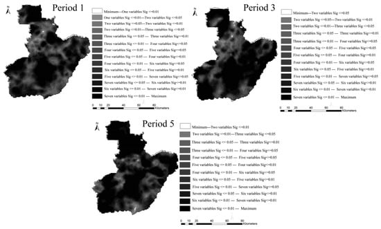 Furthermore, in order to investigate the potential regularity that influences the dynamic change of fire occurrence in different temporal periods, we standardized the change of the predictors for the grid cells of the training sets. Considering the characteristics of dynamic change for socio-economic and infrastructural predictors across temporal periods, we analyzed the correlation between the changes in fire density and the variable predictors, which can reflect the sensitivity and explain the reasons for changes in fire density over time. Moreover, the number of significant variables in the different spatial locations was evaluated for the five time periods.