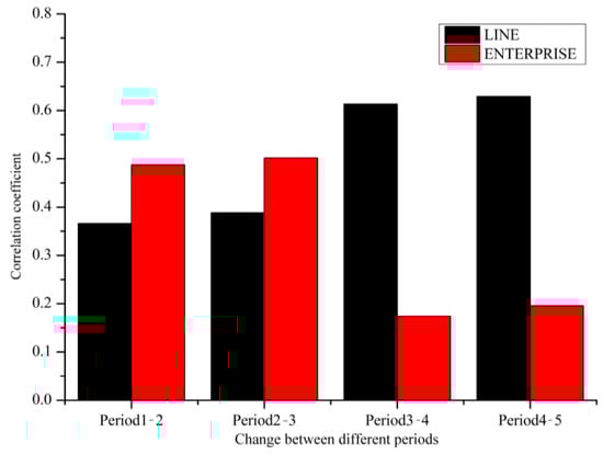 We studied the causes of the spatiotemporal changes in fire occurrence at the city scale. The seven predictors chosen by the models were not constant all the time and LINE and ENTERPRISE were the most important variables. Therefore, the changes in value of the grid cells of LINE and ENTERPRISE were calculated by subtraction from period 1 to period 2, etc., for all periods. The changes in value were standardized and thus a correlation coefficient between the change of variable and the change of fire density was obtained (Figure 14). As indicated in Figure 14, although ENTERPRISE is the most important variable in the GTWR model, the variable which influences the change in fire density temporally is varying. ENTERPRISE influences the change in fire density more than LINE prior to period 2, close to the year of 2005. LINE plays a more important role than ENTERPRISE after period 3, which can be probably explained by the expansion of the urban region and the changes in the shape of the city. An increasing number of buildings and infrastructure have been constructed in the newly built area, called the city sub-center, and a dense road network and related supporting facilities have been developed. The improvement in access by the population will indirectly contribute to the growth of fire occurrence. On the other hand, by implementing technology to control fire risk in enterprises, the frequency of fire is less than before. Moreover, with the increase in land costs in urban areas, an increasing number of enterprises have moved to the suburbs and as the population will also increase in these areas, more sub-centers of fire risk will develop.
