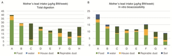 Figure 1A shows the mothers’ lead intake from food, water, house dust, and respirable dust, calculated by the equation in