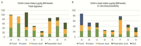 Figure 2A,B. The intake of lead seen for each child was almost three times higher compared to that of pregnant women, and ranged from 24.4 to 87.3 µg/kg body weight/week. Both the food and house-dust equally contributed to the body burden of each child’s lead levels. The proportion of lead intake by food ranged between 15%–67% (mean = 39.75%), while it ranged between 11%–68% (mean = 38.12%) due to house-dust. The IVBA of lead from food ranged between 13%–55% (mean = 34.50%), while it ranged between 12%–69% (mean = 36.75%) due to house-dust. Respirable dust (PM