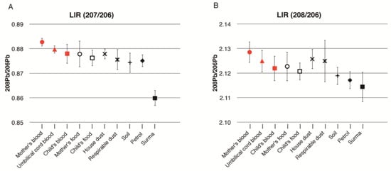 Figure 3 is a graphical representation of the mean LIR of mother’s, cord, and child’s blood, and the environmental samples for all eight families. The LIR of pregnant women, cord blood, and children’s blood were very similar based on their error bars. These LIRs were also close to those of house dust and respirable dust. However, the LIR of 208/206 of the children in