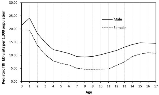 Rate of pediatric TBI visits (ICD-9-CM 959.01 excluded) by age and gender, 2013 NEDS.