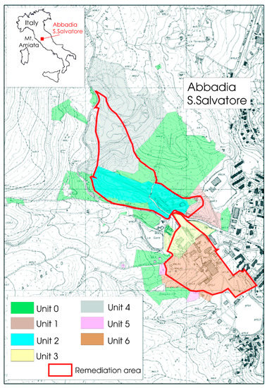 Unit 0: This sector is dominated by large green areas mainly consisting of chestnut trees and Mediterranean scrub and located far from any mining structure. No remediation actions are expected [49].