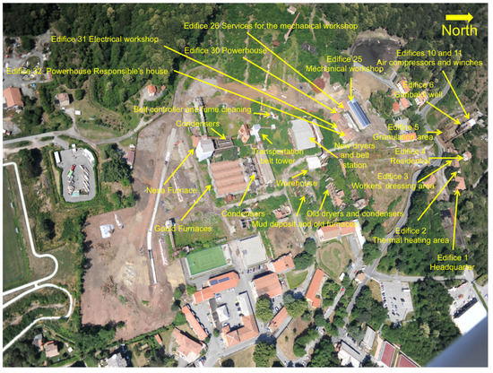 Photos from an ultralight vehicle of the main edifices and mining structures from Units 2, 3 and 6 (see Figure 1) with a description of their use when the mining district was active.