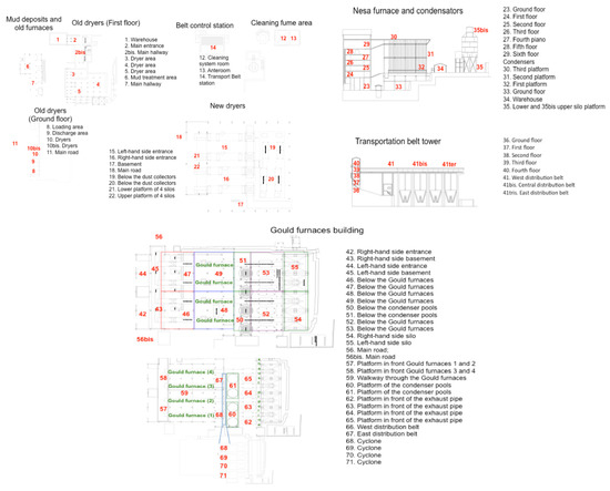 Unit 6 contains the main structures that were used to produce liquid mercury, and GEM concentrations were measured with two different approaches. From July 2011–August 2016, Lumex measurements were carried out in order to recognize where the highest GEM values were located. Then, from February–December 2016, 77 sites situated in different edifices were systematically and repeatedly measured. A description of each measured site is reported in Figure 3. The complete set of data related to gaseous mercury is fully listed in Supplementary Material S2.