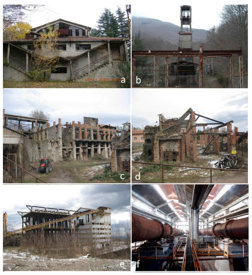 Buildings and mining structures analyzed in this work: (a) miners’ dressing building; (b) Garibaldi well; (c) old driers and condensers; (d) old mud deposit and furnaces; (e) Nesa furnace and condensers; (f) building hosting the Gould furnaces.