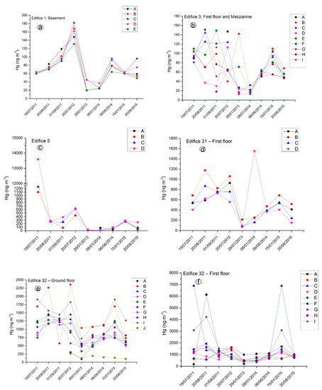 Gaseous Elemental Mercury (GEM) concentrations (in ng·m−3) versus time (from July 2011–August 2015) for selected edifices located in Units 2 and 3; (a) Edifice 1: Basement; (b) Edifice 3: First floor and Mezzanine; (c) Edifice 5; (d) Edifice 31: First floor; (e) Edifice 32: Ground floor; (f) Edifice 32: First floor. The full set of GEM data is reported in Supplementary Material S1.