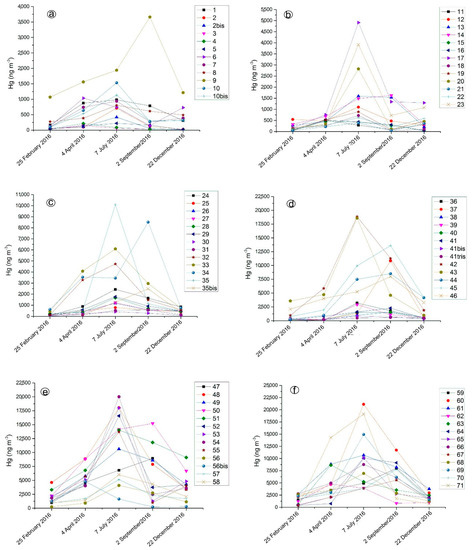 GEM concentrations (in ng·m−3) versus time (from February–December 2016) for selected edifices and mining structures located in Unit 6. The numbering reported in each figure corresponds to that reported in Figure 3. The full set of GEM data is reported in Supplementary Material S2.