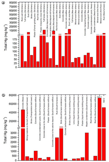 Bar diagrams for total Hg concentrations (in mg·kg−1) measured in different building materials from Unit 6; (a) samples from old driers, mud deposit and old furnaces, new driers and Nesa furnace, (b) samples from Nesa and Gould furnaces, liquid mercury bottling area and soils.