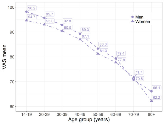 Men had a slightly higher VAS mean than women (86.4 vs. 83.9), whereas on average, women were more than 1 year older than men. The marginally higher VAS mean for men was also observed across age groups (Figure 1). Only in age group 70–79 years did women have a higher VAS mean than men (71.7 vs. 70.8). Overall, the VAS means decreased with age (Figure 1 and Figure 2).