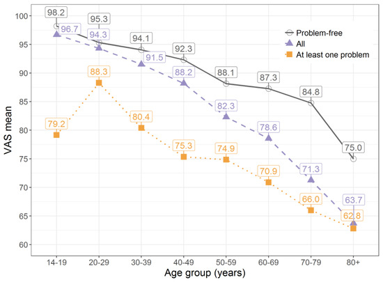 Overall, the VAS mean of the 70- to 79-year-old participants was 25 points below the VAS mean of the 14- to 19-year-old participants. This tendency was also observed for participants with at least one problem. Only the mean VAS score for those younger than 19 years (n = 12) was markedly lower. From age group 70–79 years to 80+ years, a big decrease in VAS means of around 10 points was reported. Furthermore, the percentage of the study population without any health restrictions became smaller with increasing age. Although 92.1% of age group 14–19 years were problem-free, only 7.6% of age group 80+ years reported no problems.