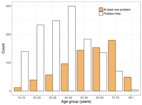 The VAS means also varied depending on whether there were problems reported in the individual dimensions or not. The VAS mean for participants in the problem-free health state (11111) was 92.3. For participants with at least one reported problem, the VAS mean was 20 points less. The VAS distribution by health status and age is illustrated in Figure 2. From age group 60–69 years onwards, the share of participants with at least one problem was greater than the share of people who reported to be problem-free (Figure 3).
