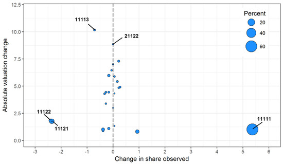 A total of 24 health states were observed by five or more respondents in both samples, covering 89.2% of the 2012 as well as the 2015 respondents. With a VAS mean of 88.1 in 2015 and 86.3 in 2012, a slight increase in VAS mean was observed by 1.8 on the 100 VAS scale. This is far below any minimal clinical relevance. Decomposition of overall change shows that the case-mix component, i.e., contributions from different health states reported, was 0.7 on the 100 VAS scale. The valuation component reached 1.1 on the 100 VAS scale, whereas the interaction term was at 0.1. Details of valuation changes vs. changes in shares observed show a 5.4% increase in the problem-free health state (11111) but small valuation change (Figure 5), but only referring to about two thirds of the respondents in the 2012 subsample analyzed here. Other health states make only minor contributions. Taken together, a marginal but clinically non-relevant increase was observed; thus, health state valuation remained quite stable.