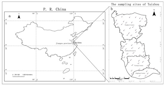 The study area, Taizhou (approx. 5786.25 km2), is located in central Jiangsu Province at 32°1’–33°10’ N and 119°38’–120°32’ E. It is an important region of the Yangtze River Delta and is characterized by a north subtropical monsoon climate with distinct seasonal divisions. In recent decades, the region has developed rapidly, and currently comprises 34,000 industrial enterprises, of which more than 1083 are scale enterprises. Electrical, chemical, building material, pharmaceutical, textile and food industries are the main industries in Taizhou. However, these industrial activities have resulted in high levels of environment pollution in the territory.