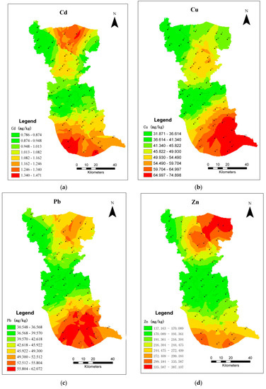 Cd and Zn concentrations were mostly affected by Zn smelters [44]. The highest concentrations of Cd and Zn were found in the south and north of the study region. The highest Zn-polluted and the second most-Cd-polluted regions were in the north, where there are several Zn refineries, such as those at Xinghong (site 5, Figure 2), Hongsheng (site 6, Figure 2), and Keda (site 7, Figure 2). The main contributors of Zn and Cd in the south, where the second most-Zn-polluted and highest Cd-polluted regions occurred, were likely to be a Zn refinery (site 52, Figure 2), and a nonferrous metal smelter (site 57, Figure 2), both in Taixing.