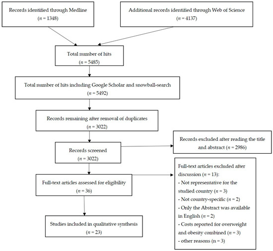 There have been a number of literature reviews on COO [,,,,,,,,,,,] including studies from before 2011. Since 2011, however, advanced methods such as microsimulation modelling [,,] have been used and have led to new findings, requiring further, systematic exploration. Furthermore, some reviews have included studies that were specific to a single country or continent, e.g., the USA [,], Canada [] or Europe [,,], and have excluded studies from all over the world. Some reviews have included studies that accounted for direct costs [,,], while others have included only indirect costs []. Direct costs include all direct medical and non-medical costs for diagnosis, treatment and transportation []. Indirect costs are the productivity loss cost due to morbidity and early mortality []. Moreover, some studies include costs for both overweight and obesity and do not separately differentiate the cost burden [,].