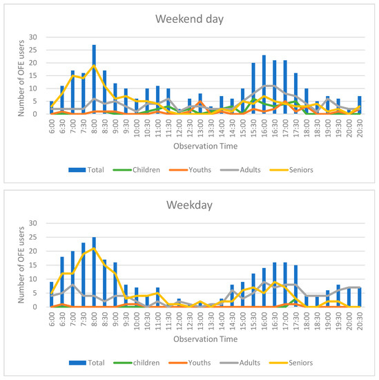 Average number of users of outdoor fitness equipment (OFE) by time of day—weekend vs. weekday.